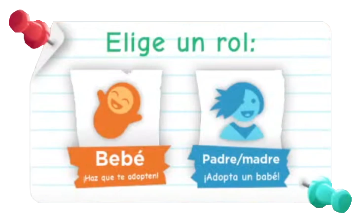 Cuando los jugadores inician sesión en Adopt Me! deben seleccionar el rol de padre o de bebé para comenzar a jugar. Según el rol elegido, los jugadores obtienen un color en el área de chat. Los jugadores que eligen padre son de color rojo y los que eligen bebé son de color azul.