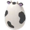 El huevo de la granja es un huevo blanco con manchas negras, pequeñas orejas rosas y cuernos de color crema. Se parece a la vaca con sus dos pequeños cuernos, orejas y manchas blancas y negras.