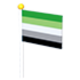 The Aromantic Flag features an aromantic flag with a white handle; this handle has a small yellow knob on its tip. The colors of the flag include black, gray, white, light green, and dark green.