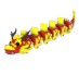 The Dragon Train features a red and yellow vehicle that resembles the Dancing Dragon. It has five seats, one being the head and the rest being a part of the body; the end seat connects to a pointed tail. Each seat is colored a vibrant red with yellow scales patterned across. Below each seat, there are small red wheels with yellow rims. The vehicle has white smoke coming out of the dragon's mouth, resembling a fire breathing dragon.