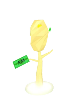 The Money Tree features a golden, jagged, round exterior connected to a tree branch, above a flat, circle-shaped base with a white glow. Every few seconds, an animation of green bills with the letters AM and golden coins explode from the top.