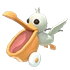 The Pelican Stroller features a large off-white Pelican with a large orange beak. It has white wheels with orange axles, and orange feet. Gray feathers are scattered throughout its body.