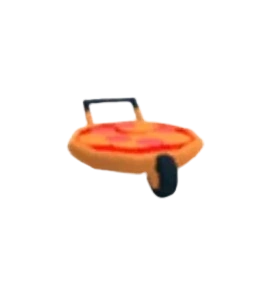 The Pizza Stroller bears a resemblance to the Pizza Float with a tan circle with red, pink, and yellow details meant to represent a pepperoni pizza. Something to note is that the bottom of the Pizza Float is much thinner than that of the Pizza Stroller. There is one black wheel on the bottom and a black handlebar.