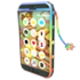 The RGB Phone Throw Toy features a phone with a brown screen with many apps on it, and a black edge with rainbow lining. There is a rainbow string with a paw print connected to the top right corner of the phone.