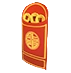 The Red Envelope is a red and golden color with an accessory attached to the front of it. This pet accessory is worn around a pet's chest.