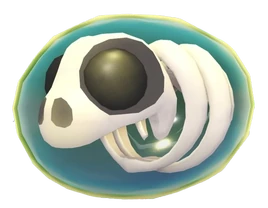 The Sea Skeleton Panda features a translucent, oval-shaped body tinted blue with a gray skeleton including a skull, spine, and eight ribs inside. It has two black eyes, with the area of the skull around them being a dark gray. It also has two dark gray indents in the skull that resemble nostrils.