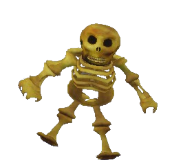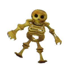 The Teddy Skele is a thin yellow skeleton with stick-like legs, a ribcage, and curved arms. Its head, sported on top of the ribcage, has 2 black eye holes.