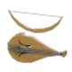 The Tundra Violin features a round, droplet-shaped violin with two gray strings, two curved holes, and a small tailpiece. It also comes with a brown crescent bow; this bow has a thin string stretching from one tip to another.