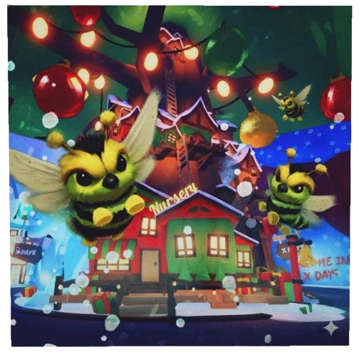 Starting from week one, the Bah Humbug minigame queue could be accessed inside the trunk of the Christmas tree behind the Nursery. In this 2D platformer-style minigame, players were tasked with defeating as many Humbugs as possible, which arrived in three waves that lasted for 60 seconds each. Humbugs had three hearts of health, and players could use the baseball bat provided to them to drain one heart of it every time they landed a hit on a Humbug. To reach some Humbugs, players had to traverse across scattered platforms and jump on the purple mushrooms to be boosted up into the air. Hitting a Humbug gave players a small boost in the air, preventing them from immediately falling and allowing them to attempt to land more hits. The amount of